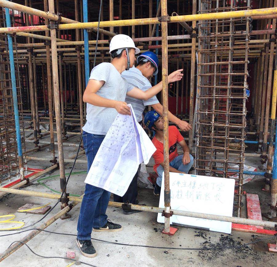 6月18日,在桂華分公司承建的梧州佛子時(shí)代廣場項(xiàng)目現(xiàn)場,當(dāng)空烈日讓偌大的工地一片熾熱,焊花飛濺,工程車來來往往,工人們揮汗如雨。雖然施工作業(yè)已經(jīng)避開了高溫時(shí)段,但工人們?nèi)员缓顾粤搜劬?,濕了衣服。盡管這樣,大家仍堅(jiān)持“全副武裝”,手套、防護(hù)用具,安全帽,一樣都沒有少,自覺遵守安全文明施工相關(guān)規(guī)范。入行兩年的施工員趙俊財(cái)抹了一把汗說道:“剛參加工作時(shí),不能和家人一起過節(jié)還挺難受的,后來把心態(tài)調(diào)整好了,想著只要家人安好,其實(shí)比什么都重要,趁著年輕,還是應(yīng)該多奮斗?!笨粗幻装舜髠€(gè)的他手拿圖紙和卷尺,蜷縮著身子,蹲在空間有限且熱得發(fā)燙的平臺上仔細(xì)檢查剛剛綁扎好的鋼筋籠,驕陽烤得他黝黑的皮膚泛出一層水光,襯著那還略顯年輕的臉龐,顯得熠熠生輝。