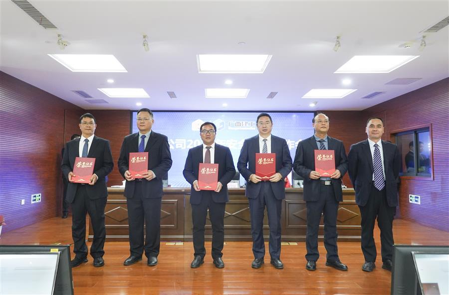 公司董事長、黨委書記覃振華(右三)上臺領(lǐng)取2024年隊(duì)伍建設(shè)工作專班獎,公司總經(jīng)理、黨委副書記蒙勝益(左一)上臺領(lǐng)取2024年管理費(fèi)用控制工作專班獎