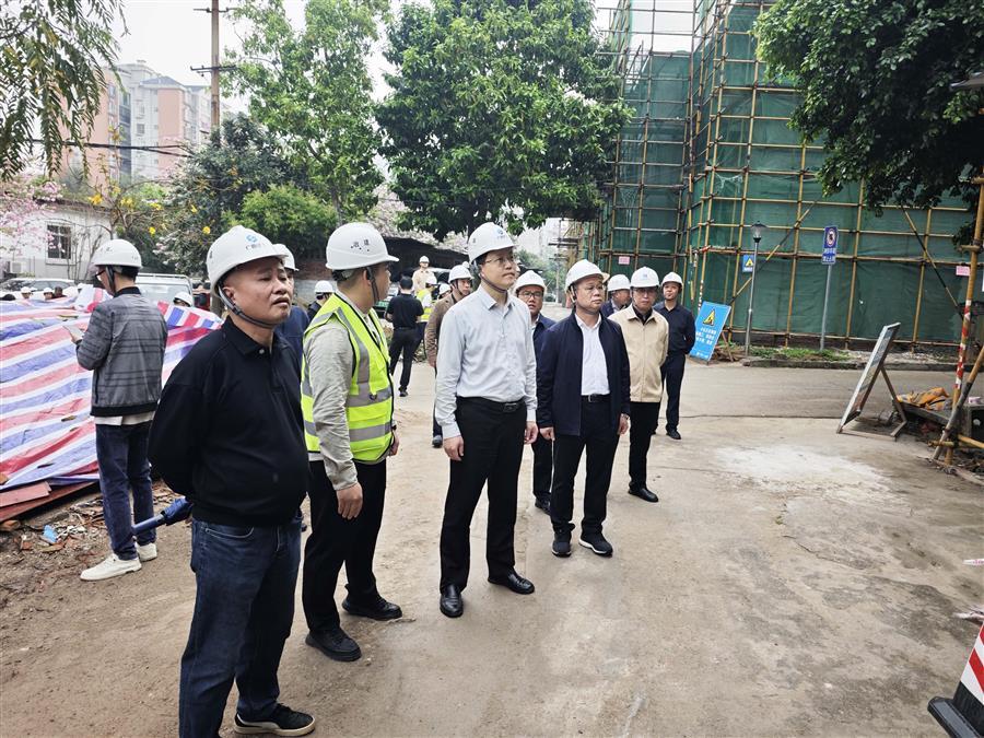石中華一行深入施工現(xiàn)場(chǎng)了解項(xiàng)目進(jìn)展情況,詳細(xì)了解項(xiàng)目建設(shè)規(guī)模、施工進(jìn)度、安全生產(chǎn)及質(zhì)量管控等情況。在聽取匯報(bào)后,石中華對(duì)項(xiàng)目前期工作成效給予充分肯定,并就項(xiàng)目當(dāng)前推進(jìn)過(guò)程中存在的困難與問(wèn)題提出具體指導(dǎo)意見。他指出,該項(xiàng)目是柳北區(qū)落實(shí)城市更新行動(dòng)、改善老舊小區(qū)居住品質(zhì)的重點(diǎn)民生工程,承載著周邊居民對(duì) “安居夢(mèng)” 的殷切期盼。他要求,施工單位要提高政治站位,強(qiáng)化責(zé)任擔(dān)當(dāng),嚴(yán)格落實(shí)安全生產(chǎn)主體責(zé)任,緊盯施工安全與工程質(zhì)量雙底線,搶抓施工黃金期,倒排工期、掛圖作戰(zhàn),確保項(xiàng)目按 180 日歷天工期高效推進(jìn),讓居民早日實(shí)現(xiàn)安居宜居。他強(qiáng)調(diào),當(dāng)前正值春季施工關(guān)鍵期,要統(tǒng)籌做好施工組織與現(xiàn)場(chǎng)管理,優(yōu)化施工方案,加強(qiáng)項(xiàng)目標(biāo)準(zhǔn)化規(guī)范化建設(shè),全力推動(dòng)項(xiàng)目提質(zhì)提速增效,柳北區(qū)區(qū)委、區(qū)政府也將全力給予項(xiàng)目支持保障。同時(shí),要始終把群眾利益放在首位,加強(qiáng)與街道、社區(qū)、居民的溝通聯(lián)動(dòng),及時(shí)回應(yīng)群眾訴求,做好施工期間的便民服務(wù)與環(huán)境保障,爭(zhēng)取群眾最大理解與支持。